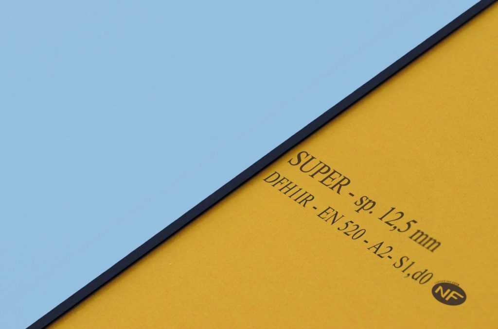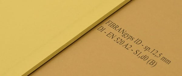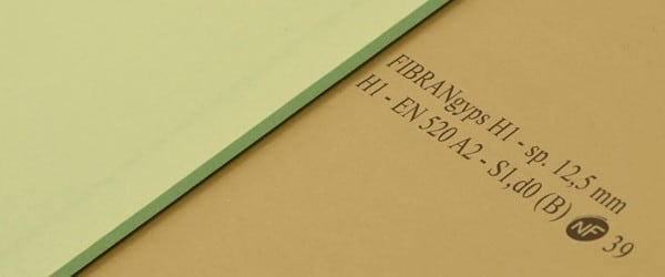 Lastra in gesso rivestito additivata per ridurre l’assorbimento d’acqua, marcata CE secondo la norma UNI EN 520 e NF secondo la norma francese.